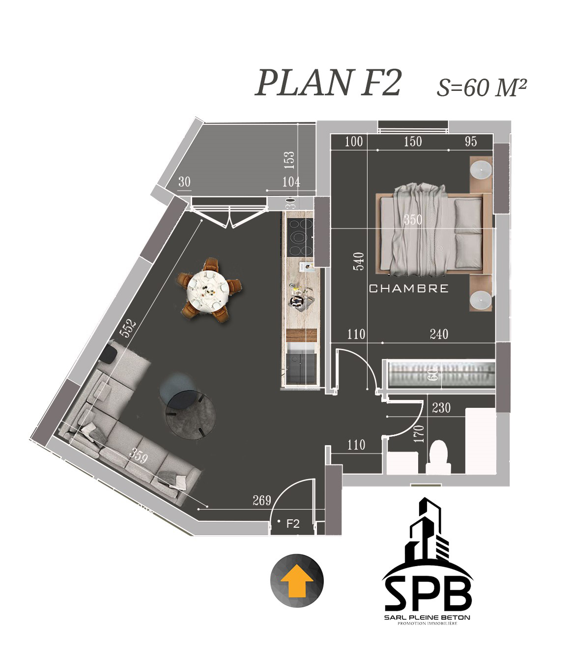 F2 : 60 m² – Un appartement bien conçu, idéal pour les jeunes couples ou les professionnels, avec une chambre confortable et un salon lumineux.