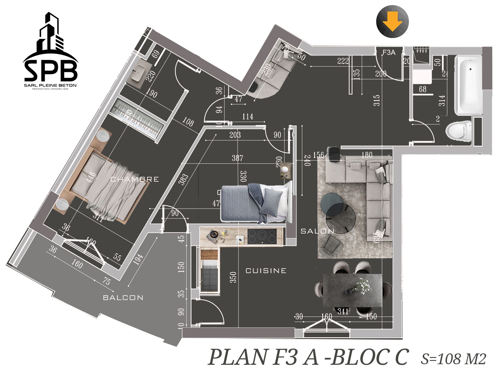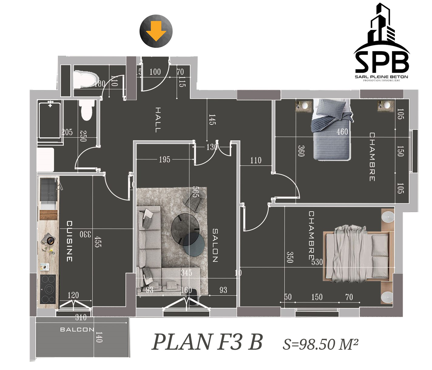 F3 Type A : 97 m² – Un agencement intelligent qui maximise l'espace, avec deux chambres spacieuses et un salon baigné de lumière naturelle.