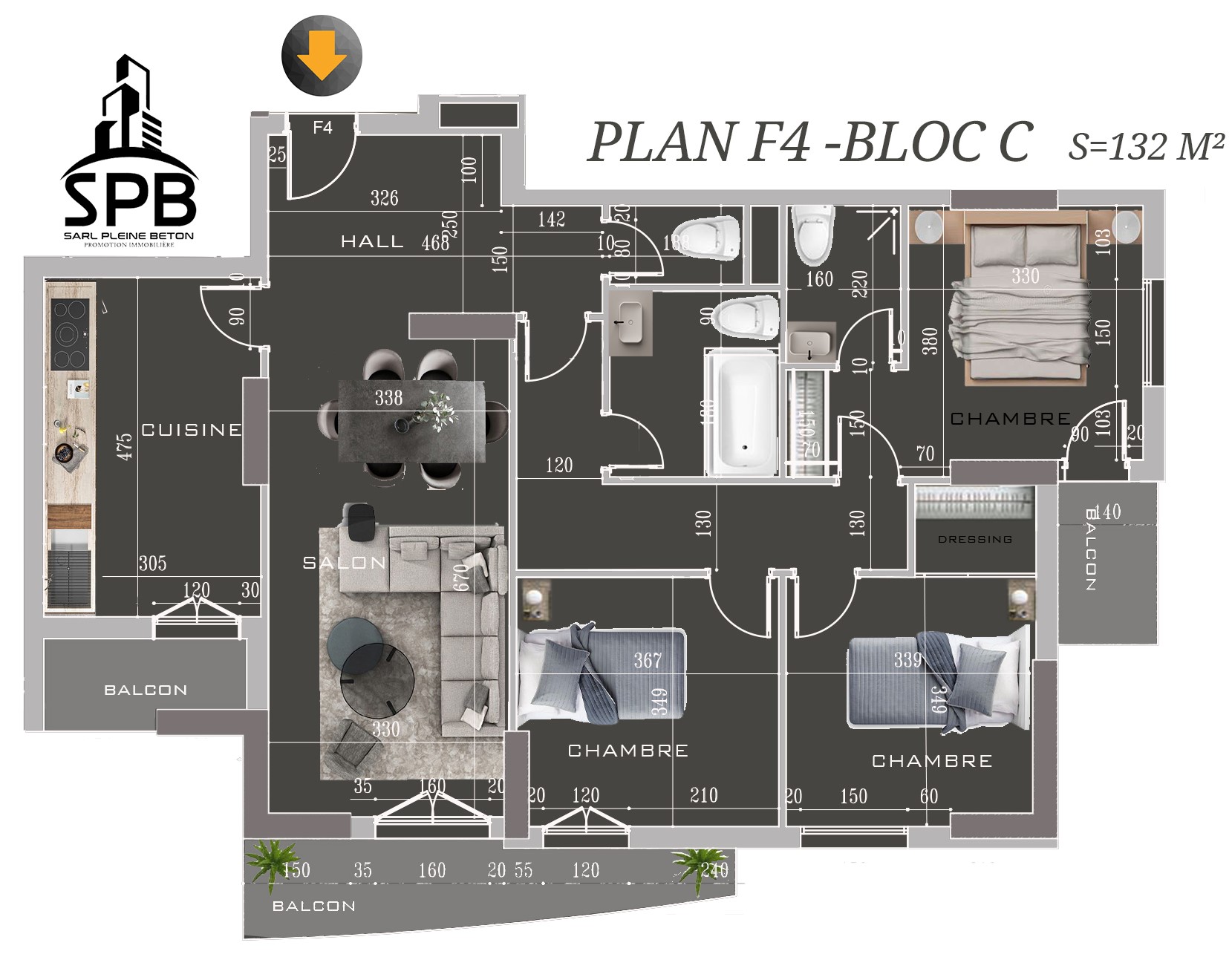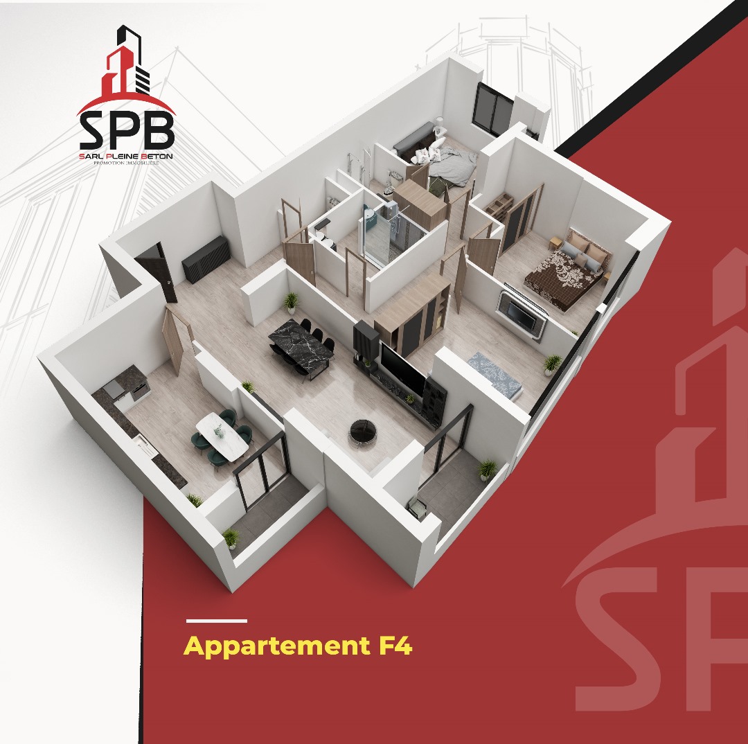 F4 : 131 m² – Le modèle le plus spacieux du bloc, parfait pour les familles nombreuses avec trois chambres, un salon ouvert et de larges espaces de vie.