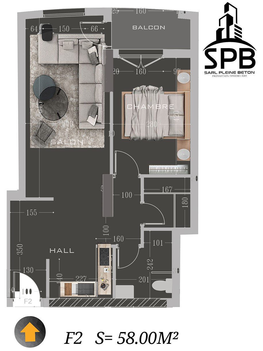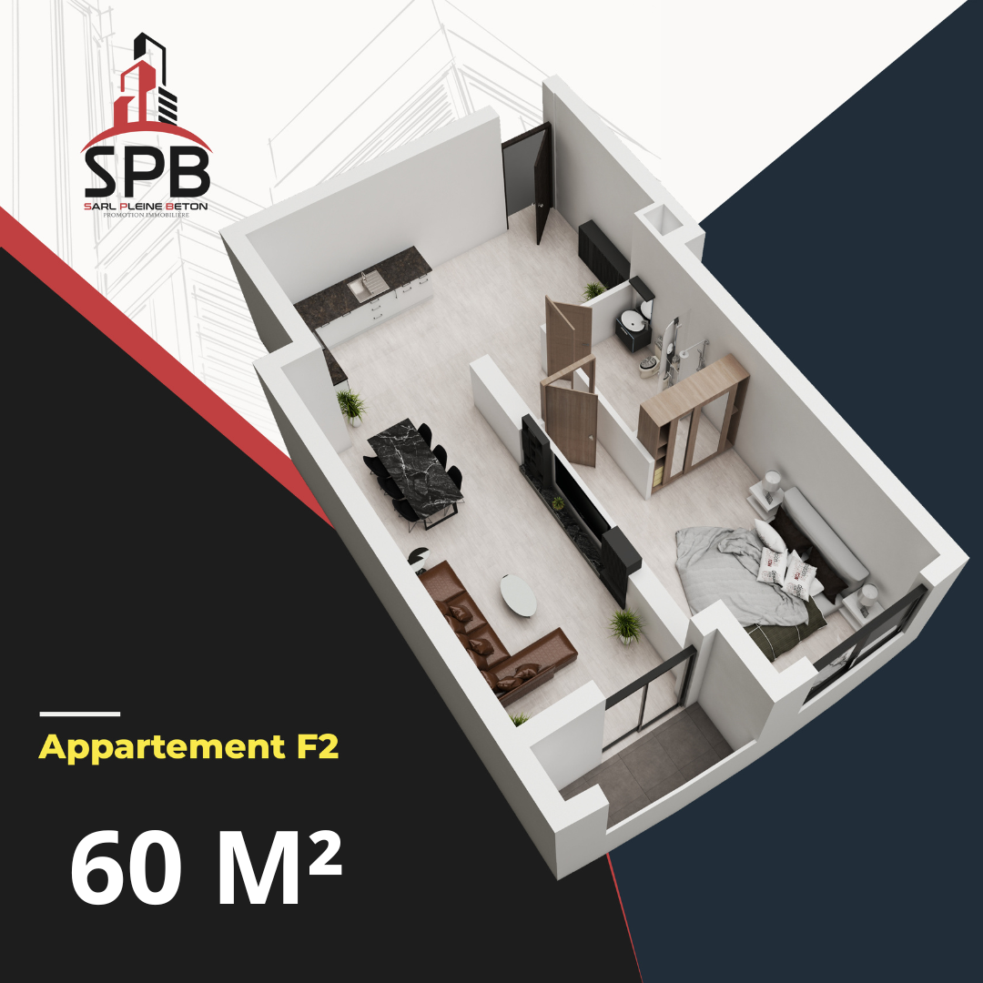 F2 : 60 m² – Un espace parfaitement agencé pour maximiser le confort, idéal pour les jeunes couples ou les personnes seules à la recherche de modernité et de praticité.