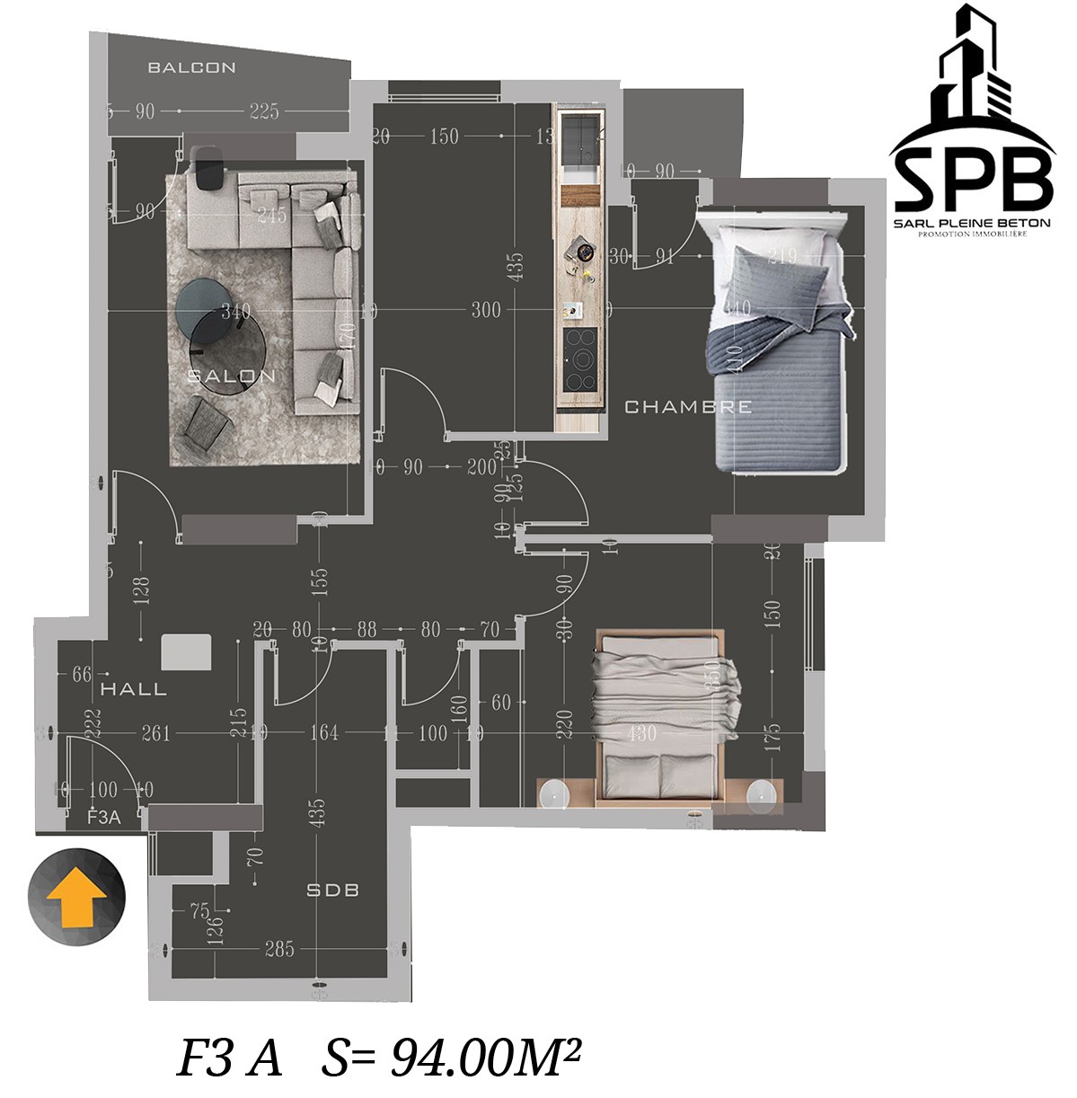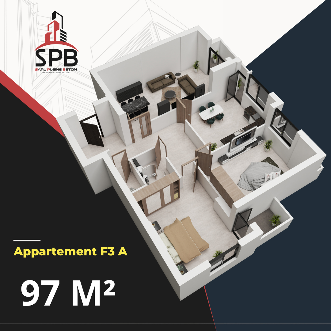 F3 Type A : 97 m² – Appartement spacieux avec deux chambres, un salon convivial, et une conception optimisée pour une vie de famille agréable.