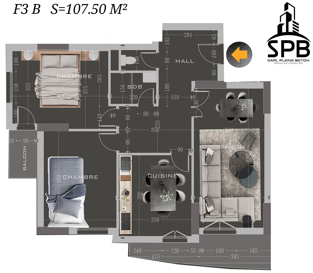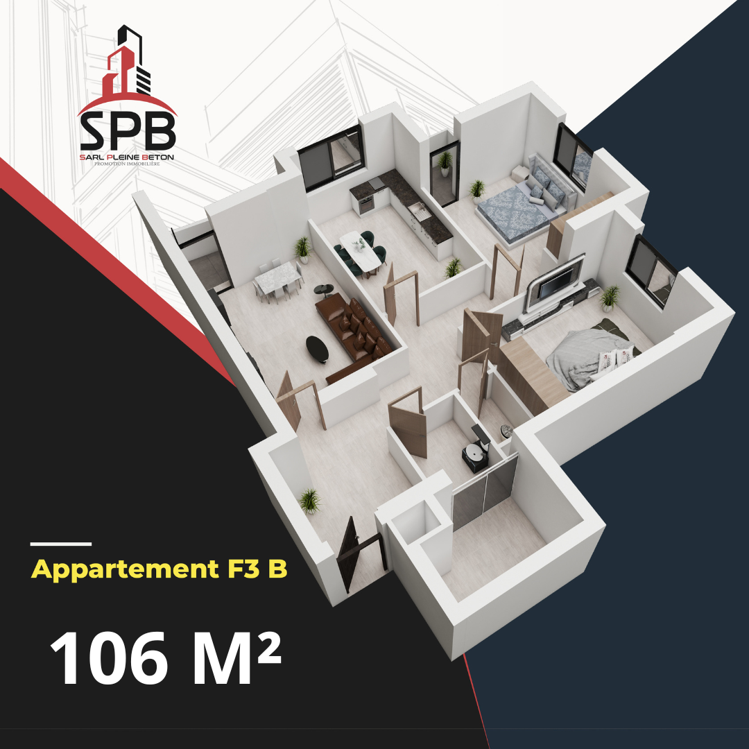 F3 Type B : 106 m² – Ce modèle propose un espace de vie encore plus grand, avec des volumes généreux, parfait pour ceux qui recherchent plus d’espace et d’élégance.
