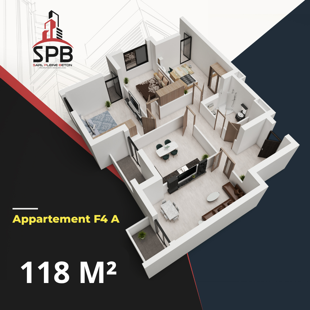 F4 Type A : 118 m² – Un logement familial avec trois chambres et une salle de séjour spacieuse, alliant confort et luxe.
