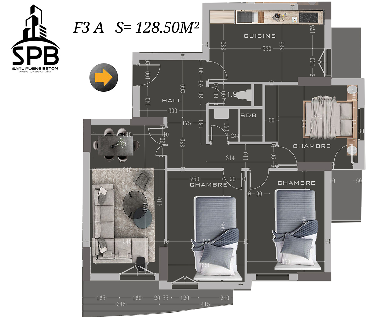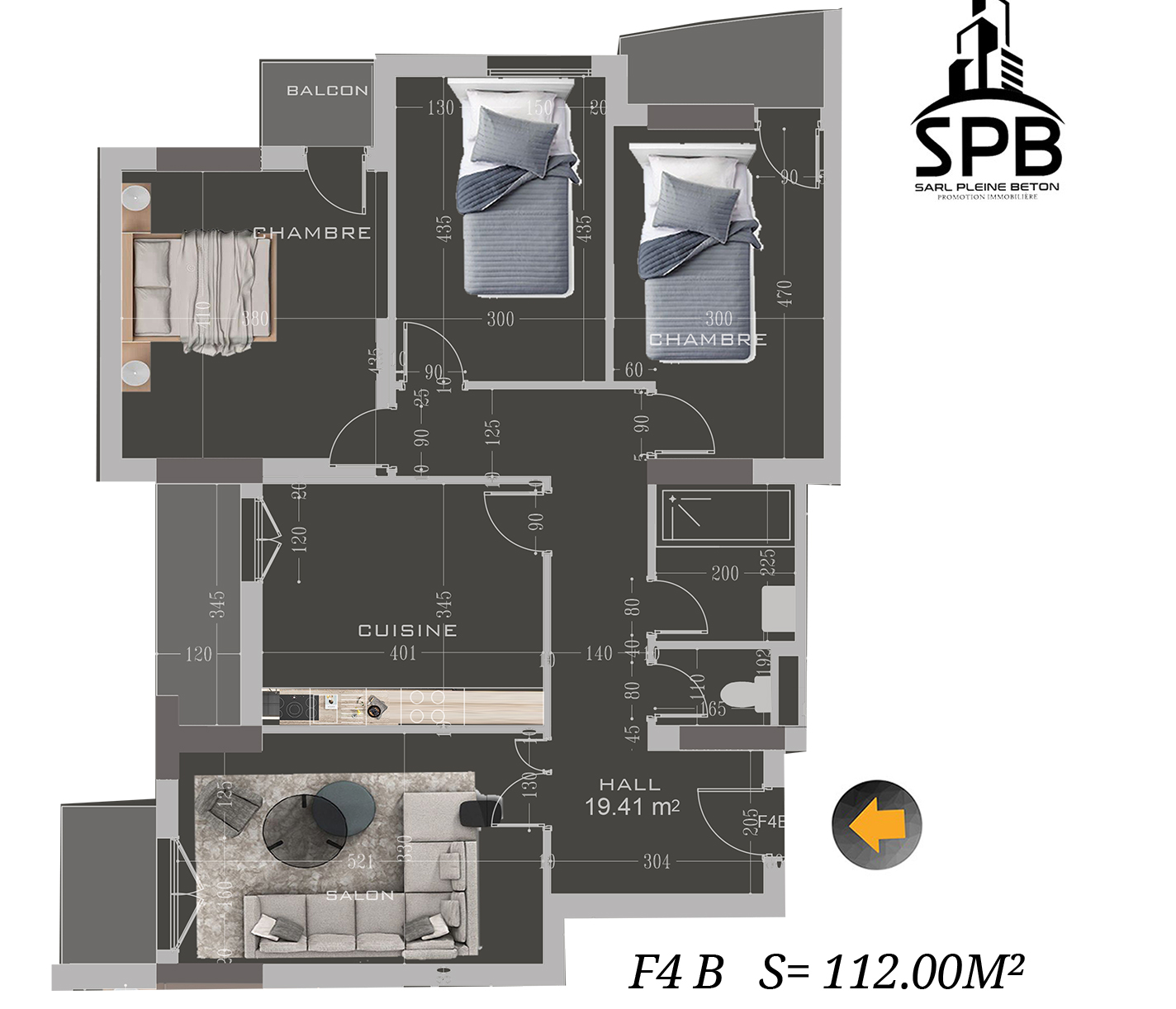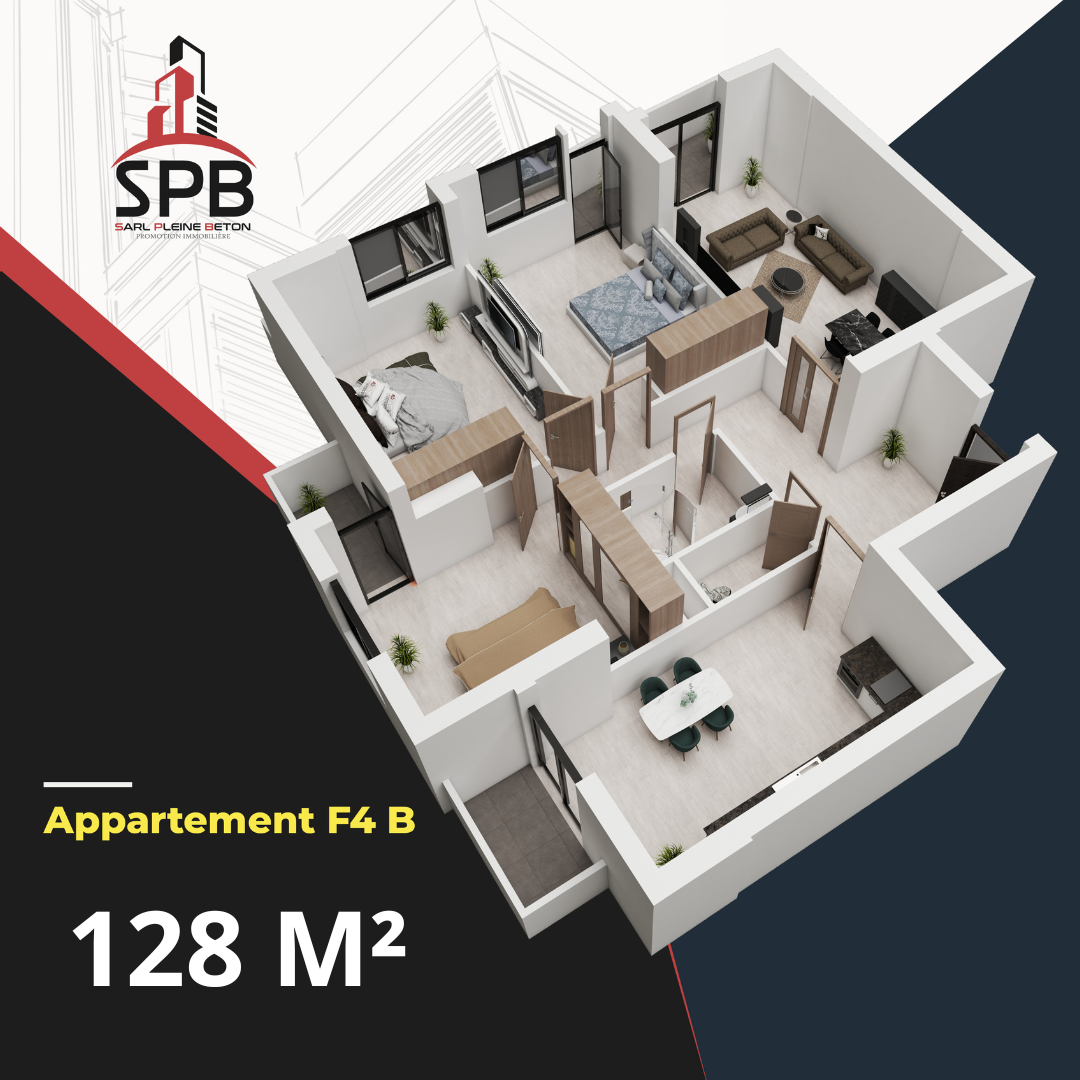 F4 Type B : 128 m² – L’appartement le plus grand du bloc, conçu pour les familles nombreuses ou ceux qui recherchent un cadre de vie encore plus spacieux et prestigieux.